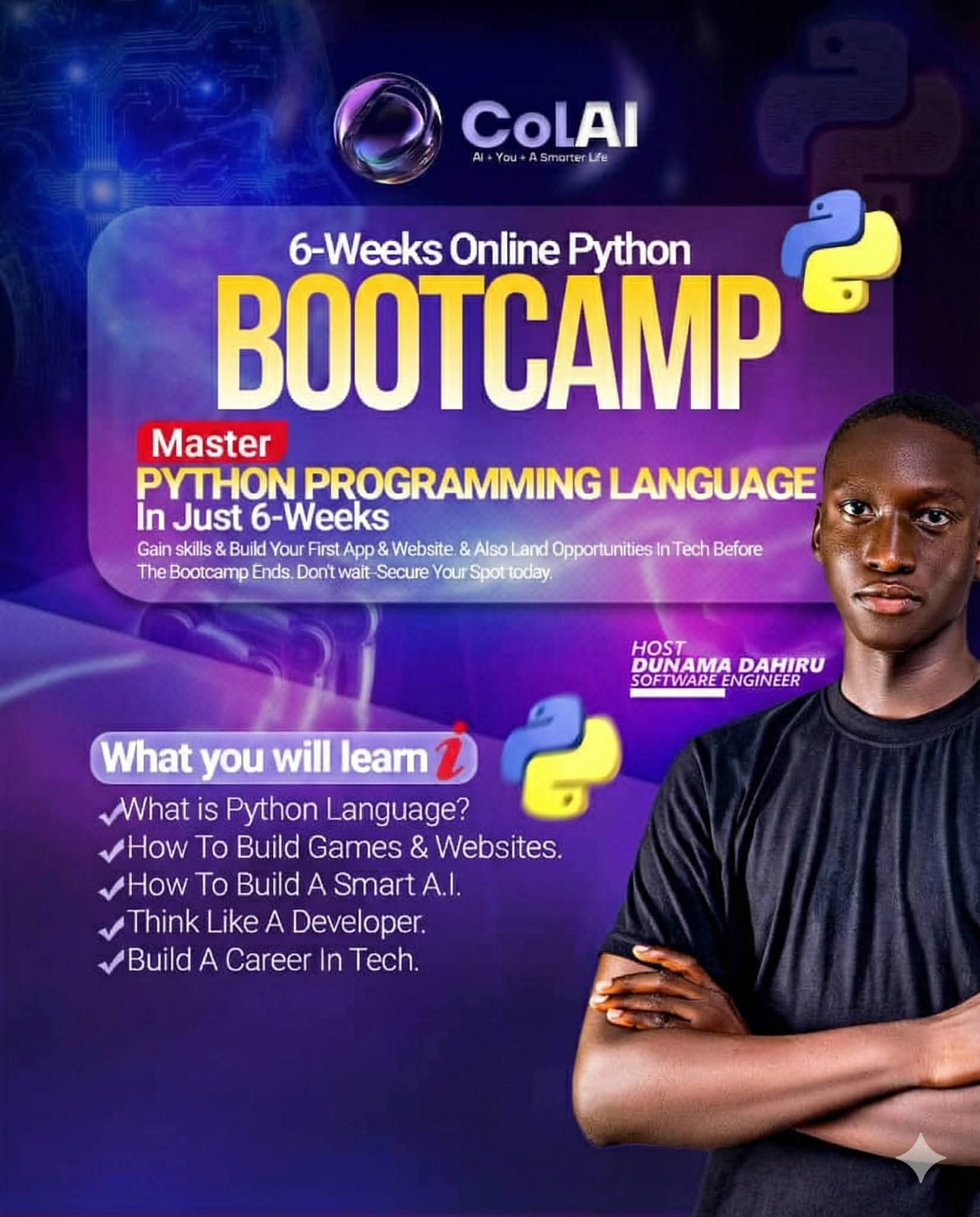 Master Python programming language in just 6-weeks. Gain skills to build your first app & website, create a smart A.I., and land opportunities in tech. Learn to think like a developer and build a sustainable career.
